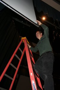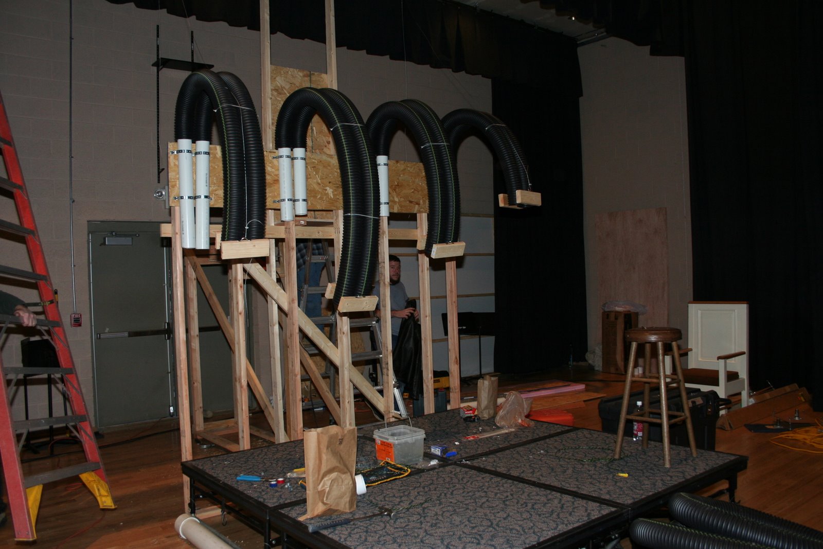 Today I arrived at Tuscarora Inn with 25 of our adult leaders and seniors to begin setting up for our winter retreat. Here are a few pics from our initial setup. The black corrugated PVC is making a hand which will move by motor. Our theme is Reach. Finished hand will be posted tomorrow. Really cool! Creative guys on my team! Thank you Jesus!