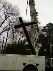 “This really happened while unloading poles yesterday … poles were tied together vertically then shifted when lifting. Mabe the Lord wanted to remind me/us of the reason for the season. Happy Easter/Ressurection Sunday!”