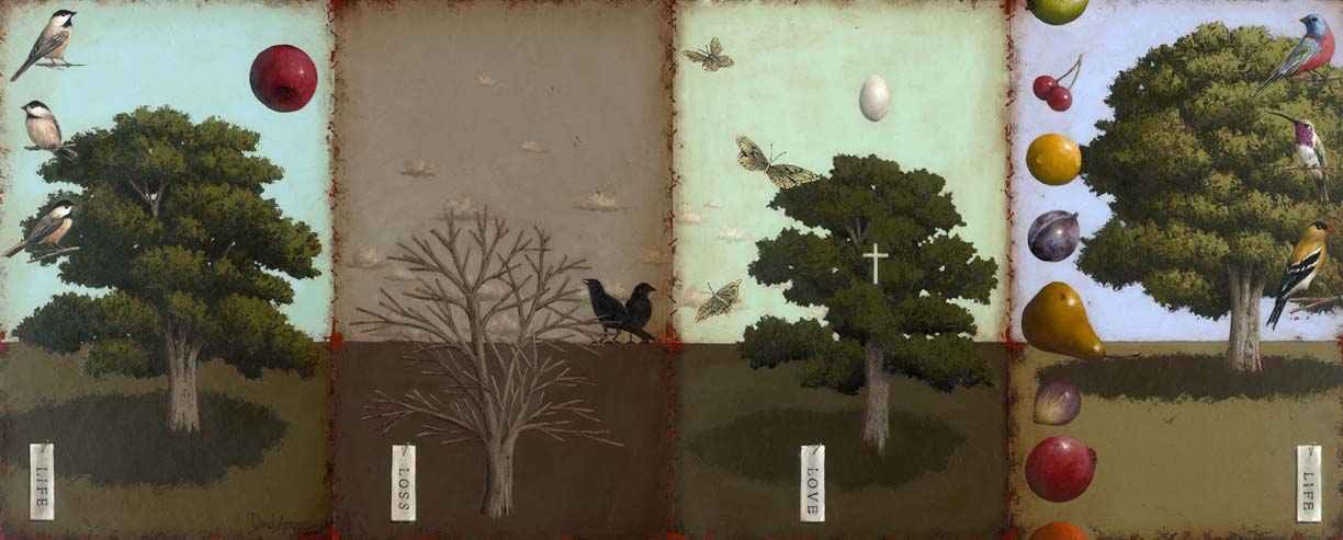 And as those who enjoy the first-fruits of Redemption, our yearning for what is ahead intensifies. A growing tension between sadness and hope is a mark of our journey home. We “groan inwardly and wait expectantly” because we are pregnant with glory, and birth pains abound. David captures this gradual and groaning ascent home by positioning the tree of love higher in elevation than the tree of loss, but not as high as the tree in the last panel, where once again, we meet the tree of life.
