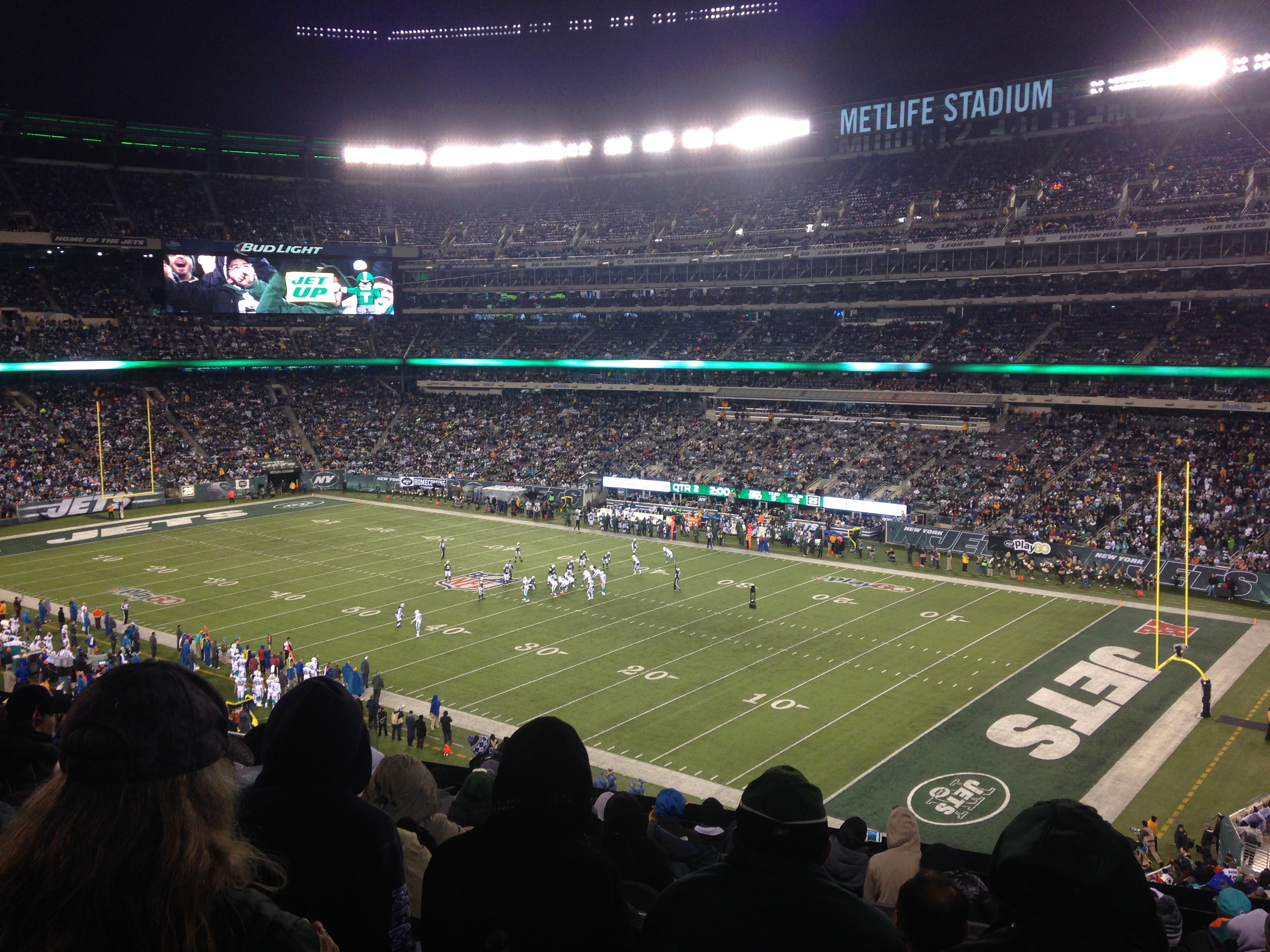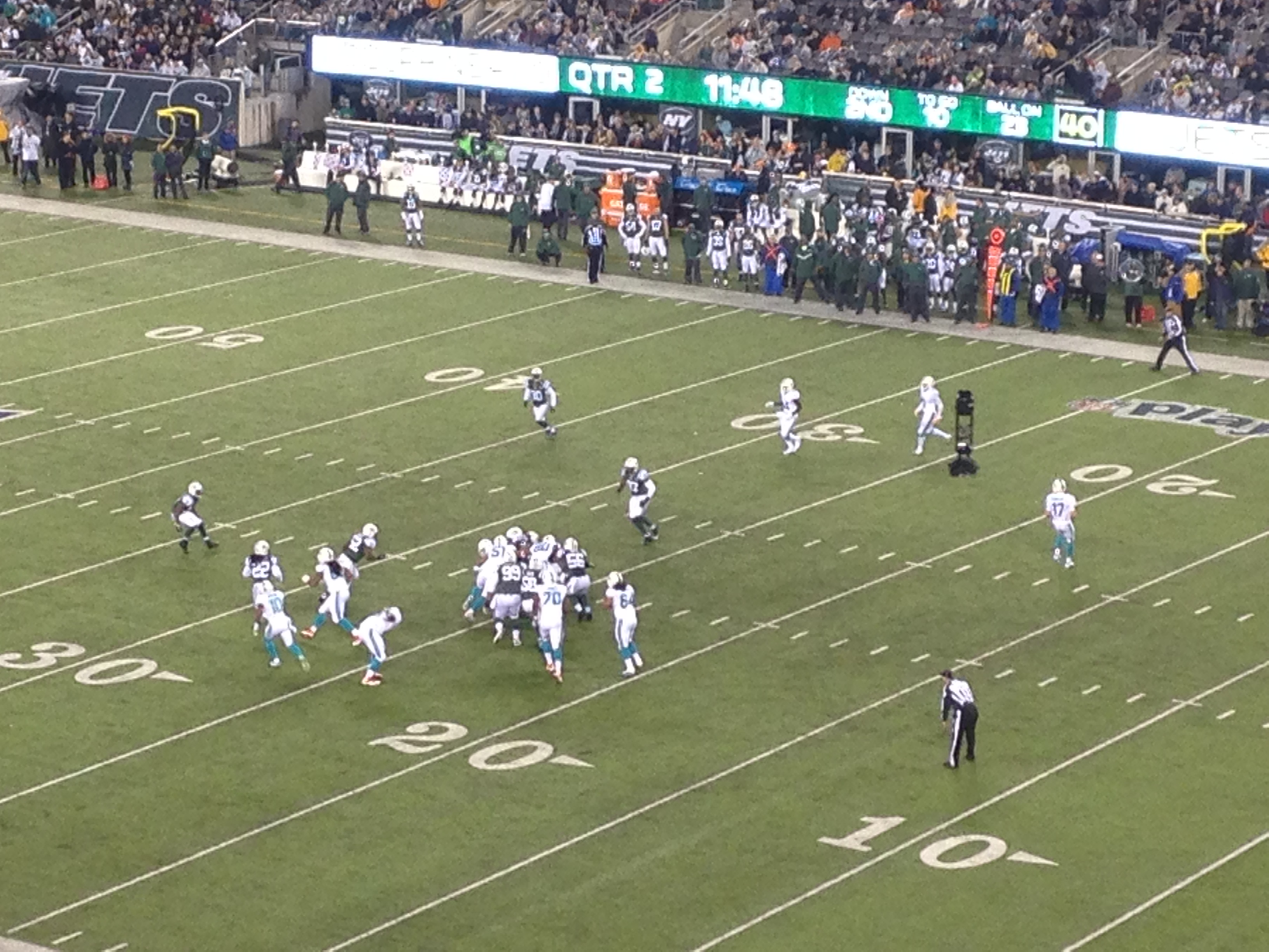 On Monday night, thanks to some very kind friends, our family had the fun of going to the Jets vs. Dolphins game at Metlife Stadium. It was the first NFL game for all of us. (Ady and I went to a pre-season game a few years ago, but that was like a scrimmage.) It’s a partial bucket-list check-off item. For the full check-off, we need to go to a Cowboys game! (I hear next year they’re playing, I mean beating, the Jets.)